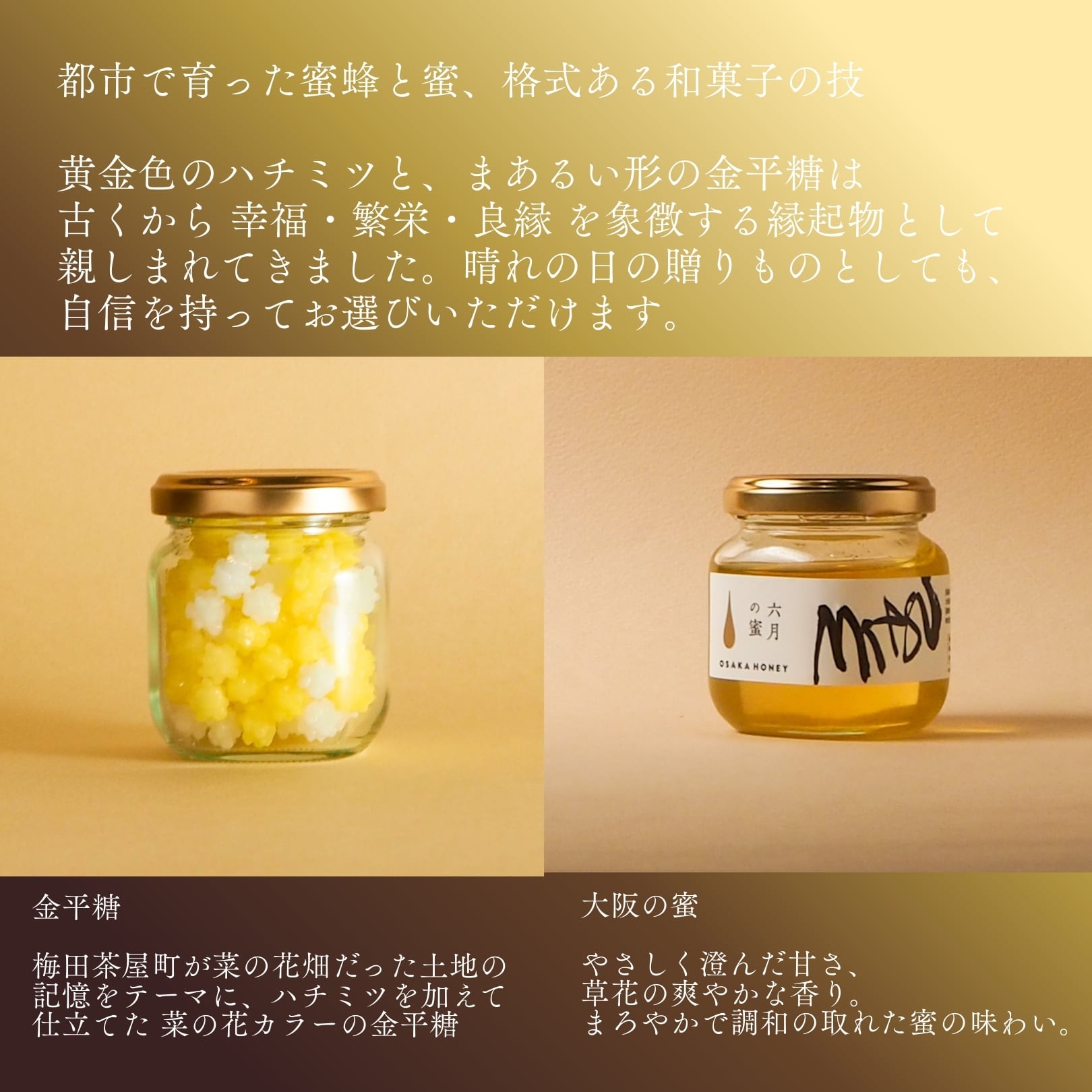 ★大阪の都市部でミツバチたちが集めた 生はちみつ と、その蜜源をイメージして仕立てた 蜂蜜金平糖(菜の花) を詰め合わせた、大阪ハニーならではの贈りものセットです。