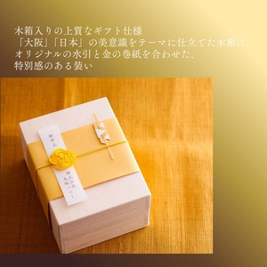 「大阪」「日本」の美意識をテーマに仕立てた木箱に、オリジナルの水引と金の巻紙を合わせた、特別感のある装い。ご挨拶・ご結婚祝い・季節の贈答など、あらたまった場にもふさわしい佇まいです。