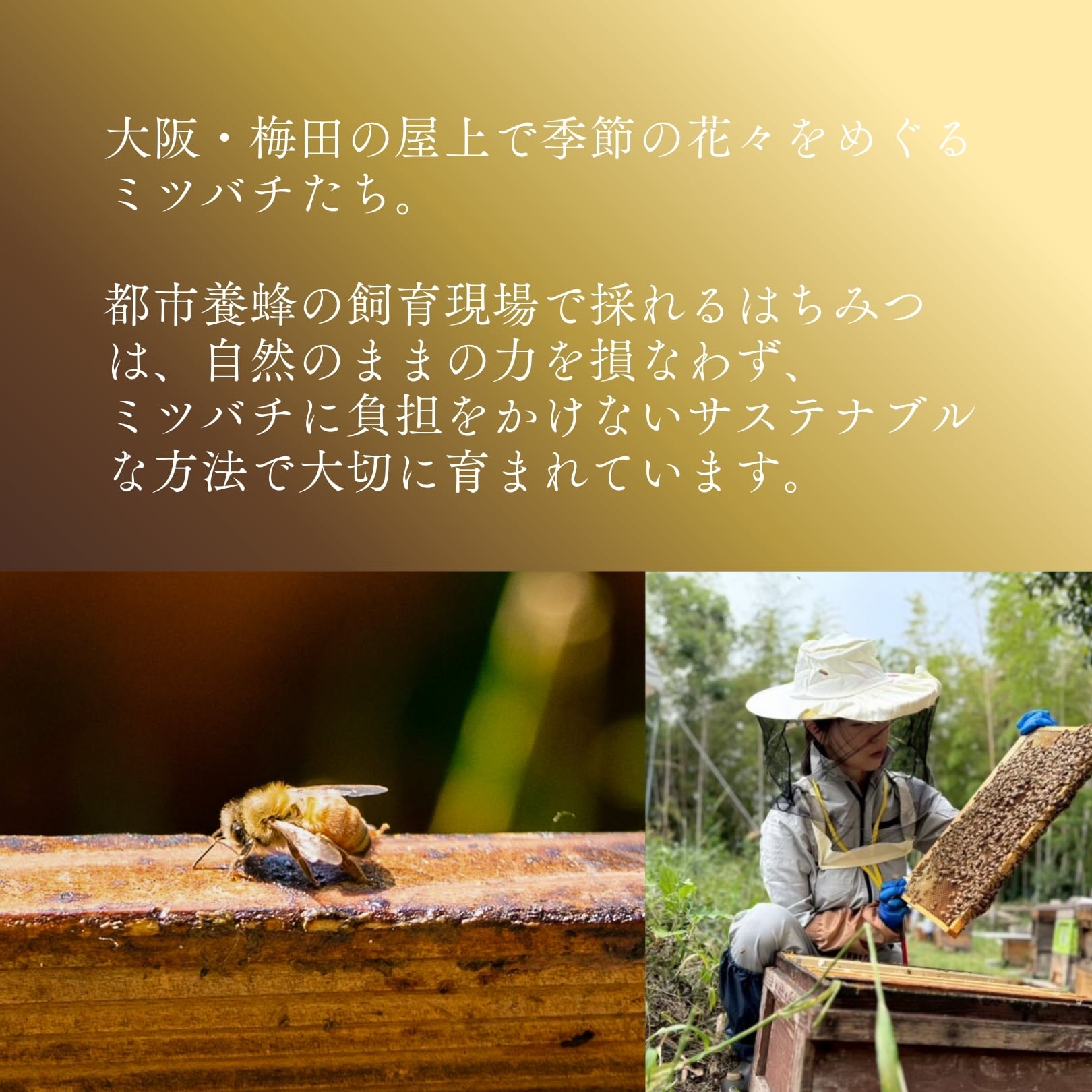 大阪・梅田に咲く花々から集めた百花蜜を完全非加熱・無加工 で瓶詰め。深いコク、やさしい甘さ、花の余韻までそのまま味わえる特別な蜂蜜です。自然のままだからこそ、香りも後味も豊かに広がります。