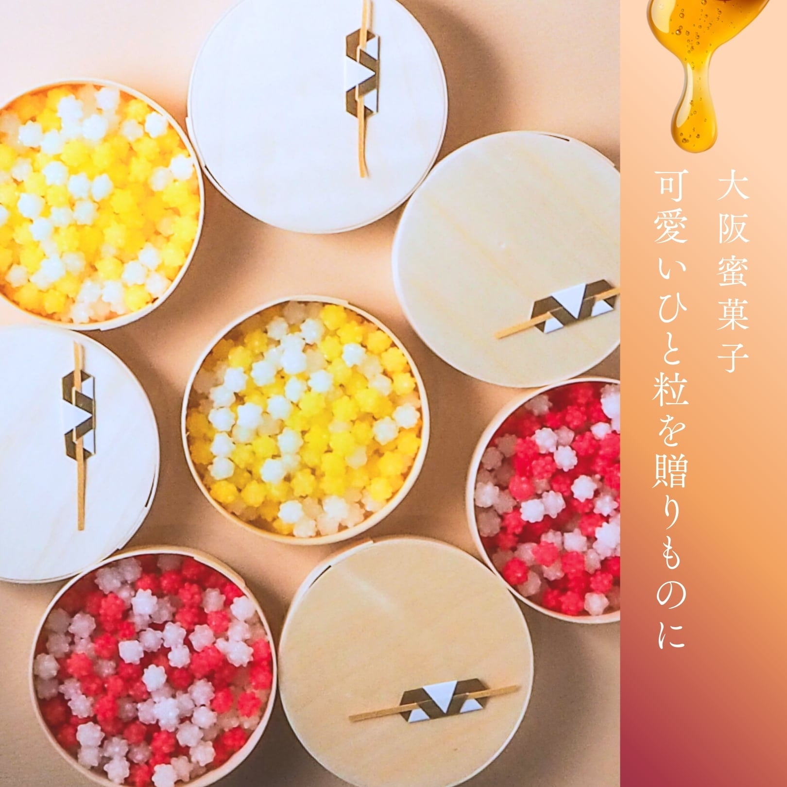 金平糖は砂糖菓子の中でも特に繊細な製法で、職人が大釜を回し続けながら時間をかけて結晶を育てます。そこに大阪産ハチミツを合わせることで、ふわっと広がる蜜の甘さとあとからやさしく訪れる生姜のぬくもりを感じる、上品で奥行きのある味わいに仕上がりました。