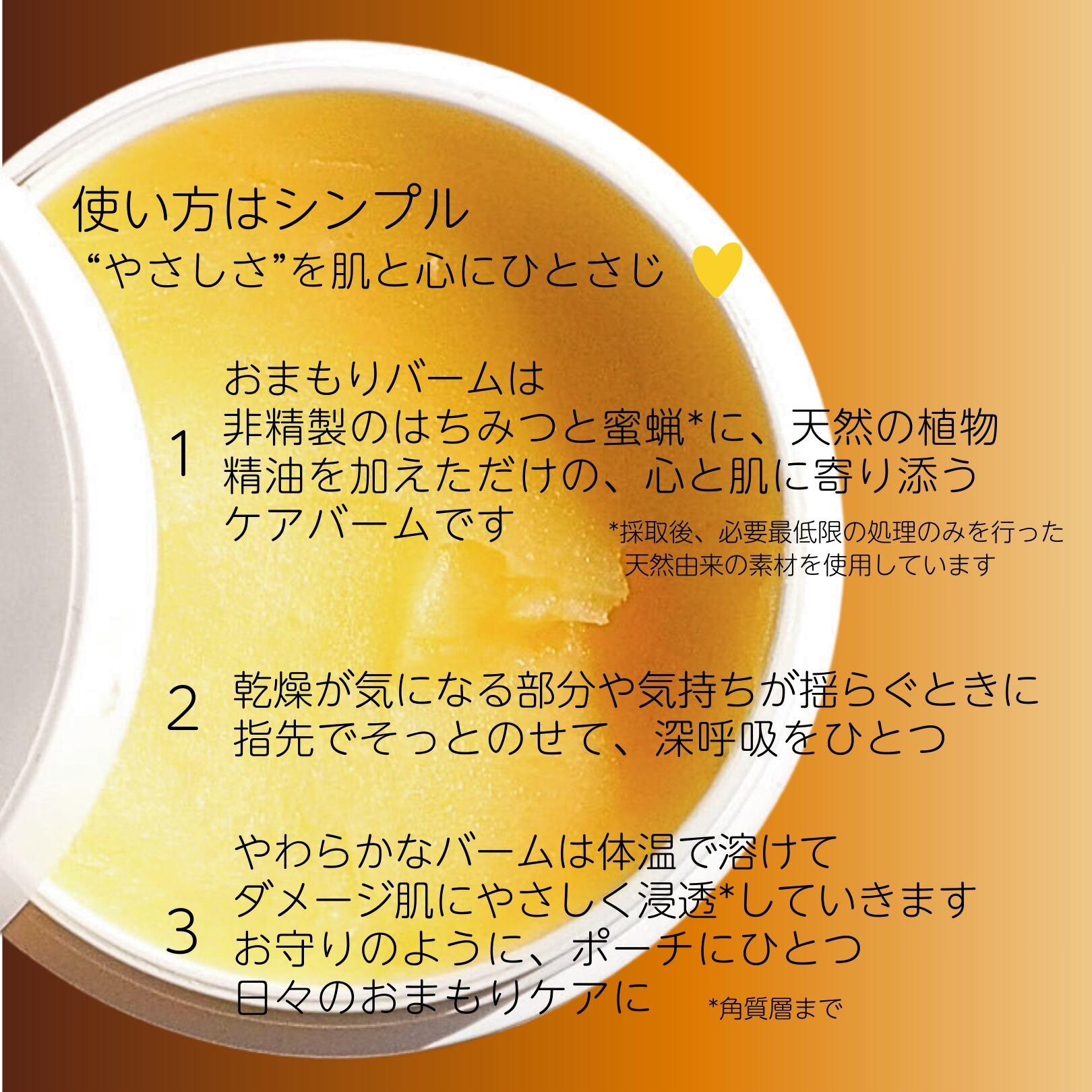 ①指先で適量をとり、手のひらで温めて柔らかくします→②気になる部分(手、ひじ、かかと、唇、爪まわり、顔など)にやさしくなじませます。