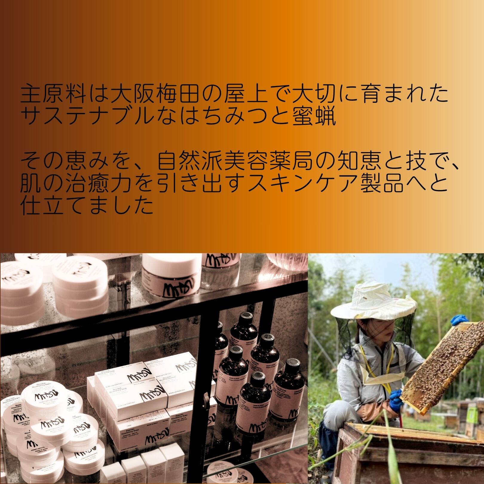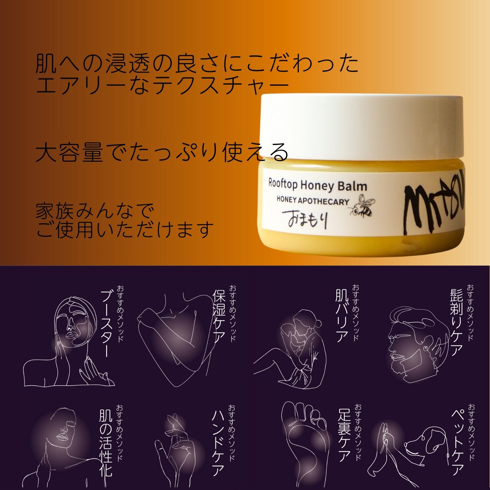 大阪・梅田の自社養蜂場で採れたハチミツ(保湿)とミツロウ(保護)をベースに、肌をやわらかく整えるホホバオイル・シアバター・椿油・植物オイルを贅沢にブレンド。自然指数100%(ISO16128準拠) の、家族で使えるやさしい処方です。