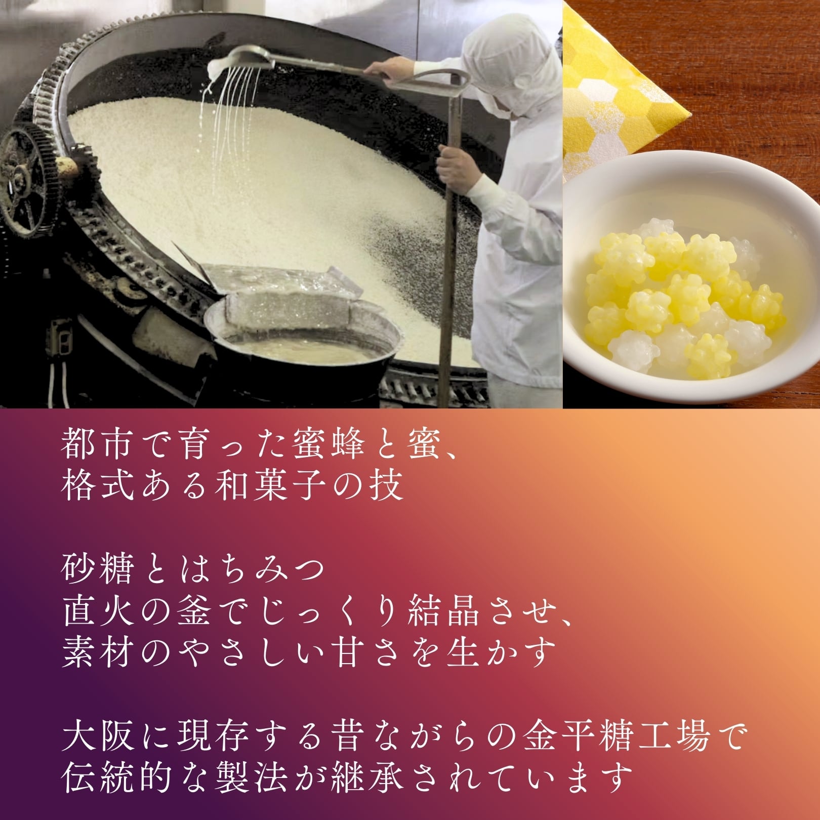 職人の手で何十時間も回される大釜の中、結晶が少しずつ重なり合い丸みと角を帯びていくその工程は、まるで時間をかけて福が育まれていくようでもあります。そこに都市養蜂のハチミツを合わせることで、金平糖はより上質な輝きをまとい、口に含んだ瞬間、華やかな蜜の香りがふわりと広がります。