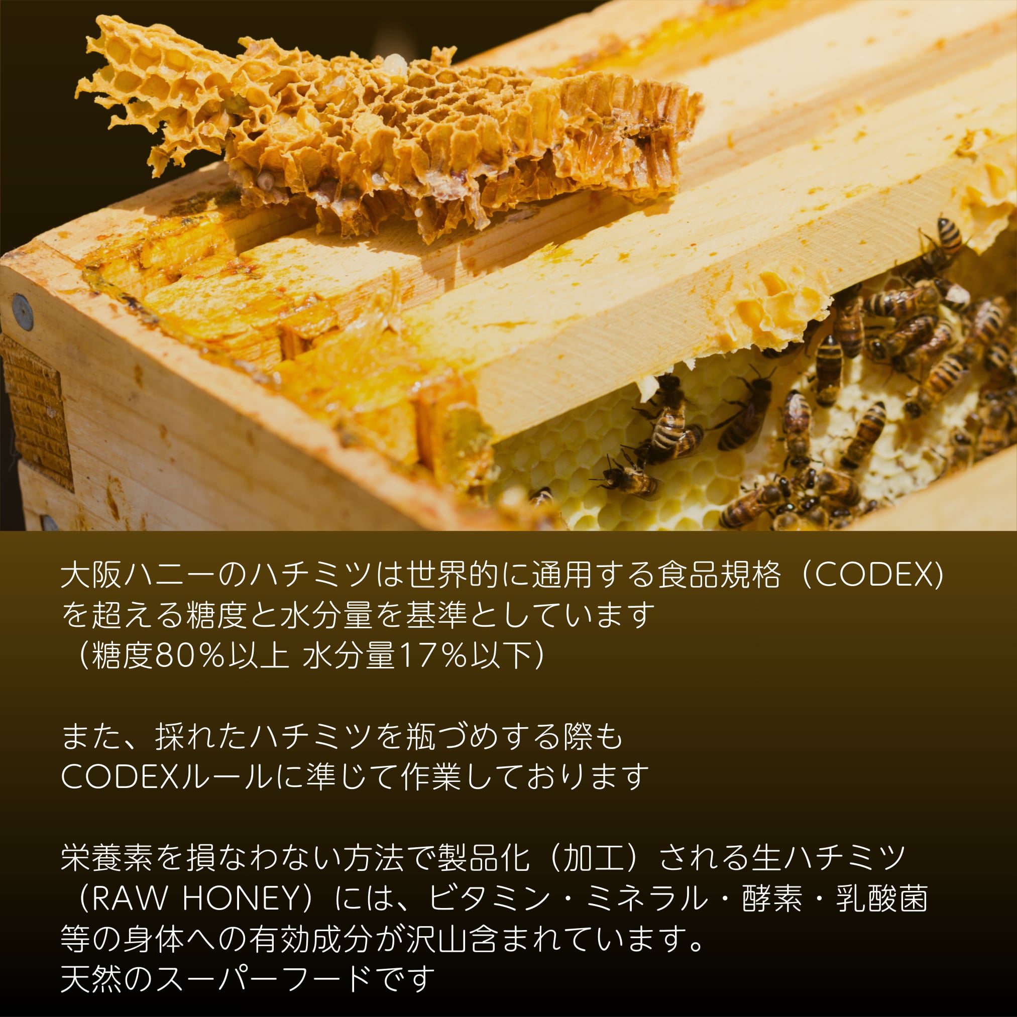 非加熱・無加工、生きたハチミツ酵素や天然の栄養成分はそのまま。大阪都市部で活動する都会のミツバチたちが集めた大阪の生ハチミツを季節ごとに瓶詰め。